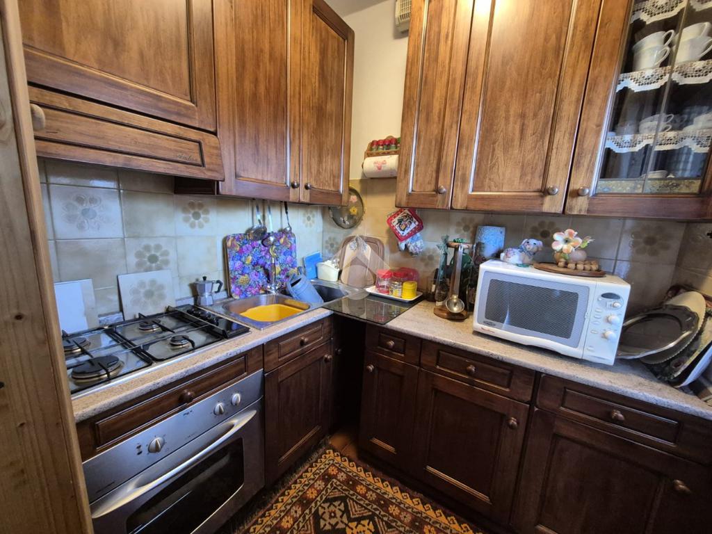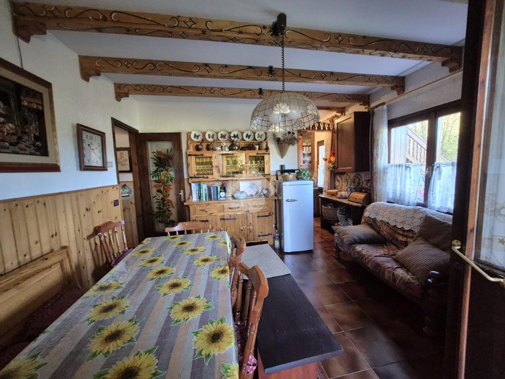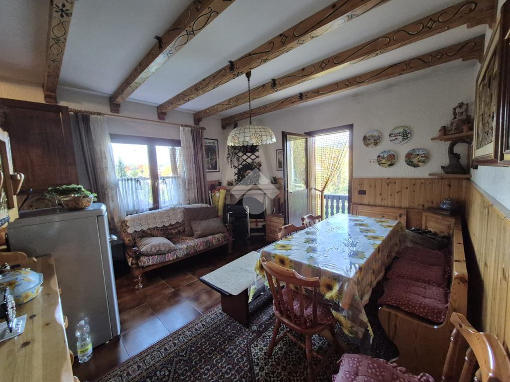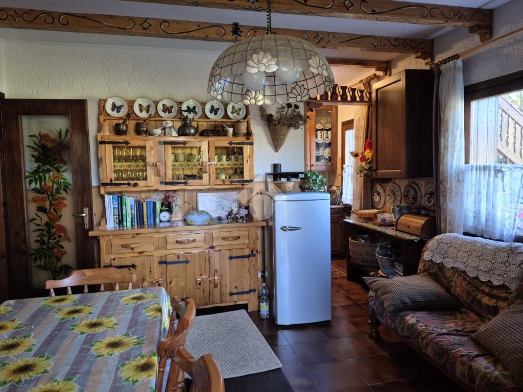 L’abitazione, dotata di ingresso indipendente e terrazza privata, si apre su un ampio soggiorno con caminetto a legna e un angolo cottura.